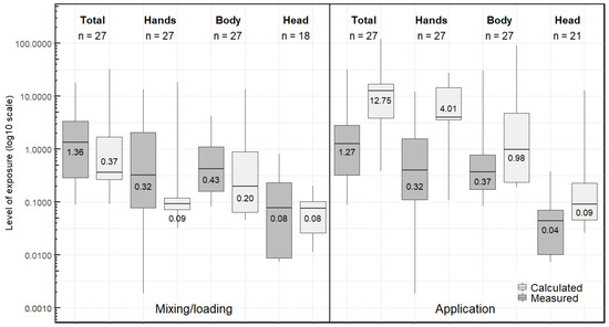 - Wong, H.L.; Garthwaite, D.G.; Ramwell, C.T.; Brown, C.D. Assessment of exposure of professional agricultural operators to pesticides. Sci. Total Environ. 2018, 619-620, 874–882. [Google Scholar] [CrossRef] [Green Version]