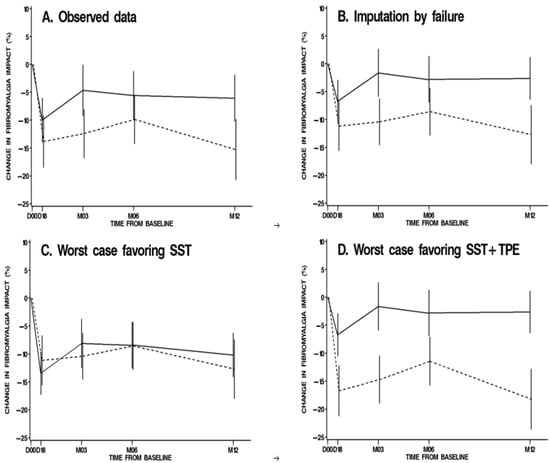 - Bennett, R.M.; Bushmakin, A.G.; Cappelleri, J.C.; Zlateva, G.; Sadosky, A.B. Minimal clinically important difference in the fibromyalgia impact questionnaire. J. Rheumatol. 2009, 36, 1304–1311. [Google Scholar] [CrossRef] [PubMed]