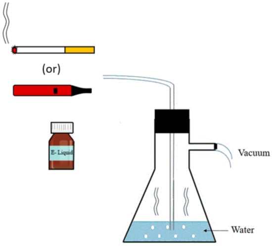 Standard IR3F cigarettes (Kentucky Tobacco Research and Development Center, Orlando, FL, USA) and two different e-cigarette liquids containing 0 and 24 mg nicotine (Vaper Vapes Inc., Sand City, CA, USA) were used to prepare cigarette smoke condensates (CSC) and e-cigarette smoke condensates with nicotine (ECSC) and without nicotine, (ECSC (−)), respectively. Cigarettes/e-cigarettes (Weez Inc., Lombard, IL, USA) were inserted into the end of a plastic tube connected to a vacuum flask containing 20 mL water as described previously []. The other outlet of the flask was attached to a standard vacuum line. The cigarette/e-cigarette was lit, and smoke was extracted by using the vacuum to pull down the smoke into the water (Figure 1). This process was repeated for 20 cigarettes and 20 mL of the different e-liquids, which resulted in similar nicotine concentrations for CSC and ECSC (3.04 and 2.99 mg/mL, respectively), while nicotine was not detected in ECSC (−) as expected. The concentration of nicotine in the prepared condensates was measured by High-Performance Liquid Chromatography (HPLC 1100 with UV detector at 254 nm, Agilent Technologies, Santa Clara, CA, USA) (Figure A1). The HPLC system was equipped with an Agilent Eclipse XDB-C18, 3.5 μm, 4.6 × 150 mm column, using H2O with 0.1% trifluoroacetic acid as the mobile phase A, and methanol with 0.1% trifluoroacetic acid as the mobile phase B. The gradient was 5–95% mobile phase B over 4 min then held at 95% mobile phase B for 4 min, then returned to 5% mobile phase B for 1 min. The flow rate was 1 mL/min. UV absorbance was detected at 254 nm using a diode array. Pure nicotine (N) (Thermo Fisher Scientific Inc., Wilmington, DE, USA) served as a standard control for all experiments.