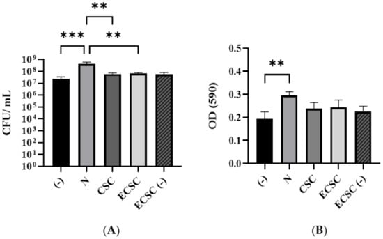 Effect of nicotine from different sources on C. albicans biofilm growth was determined by (A) CFU and (B) MTT assay in YPD medium, ** p < 0.01; *** p < 0.001. ((−): control, N: pure nicotine, CSC: cigarette smoke condensate, ECSC: e-cigarette smoke condensate with nicotine and ECSC (−): e-cigarette smoke condensate without nicotine).