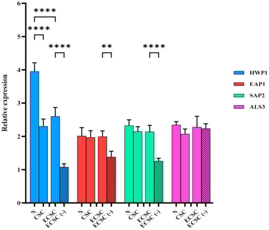 Since the above results showed that N increased C. albicans biofilm formation, we determined whether this observation involve the regulation of certain C. albicans genes that were previously described for their role in virulence [,,]. Quantitative RT-PCR demonstrated that HWP1 gene expression was significantly increased (p < 0.0001), following exposure of C. albicans planktonic cells to N (4-fold), CSC (2-fold), and ECSC (2.5-fold) (Figure 4). In addition, significant differences in the expression of HWP1, SAP2, and EAP1 were identified between the ECSC and ECSC (−) groups (Figure 4).