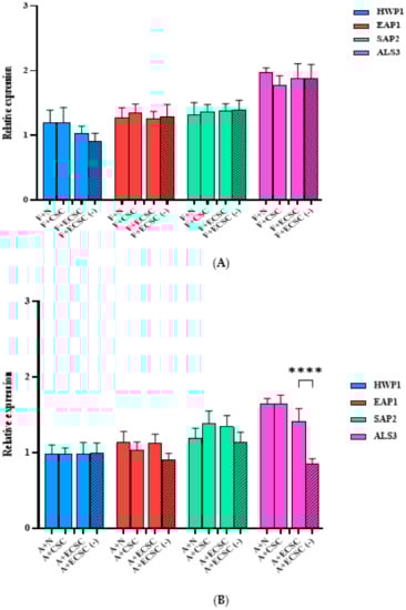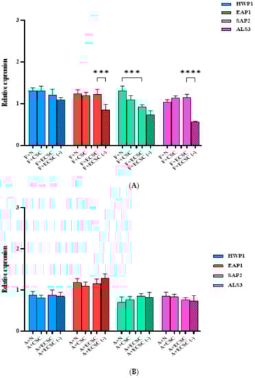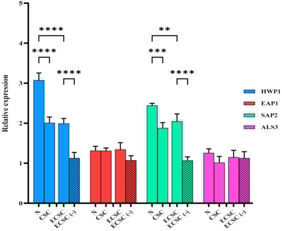 Overexpression of HWP1 and SAP2 was detected in C. albicans biofilms treated with N (3-fold and 2.5-fold, respectively), CSC (2-fold for both), and ECSC (2-fold for both) (Figure 5) compared to the untreated control (−). However, no significant difference in the expression of EAP1 and AlS3 was observed in C. albicans planktonic and biofilm cells between the different groups (Figure 5).