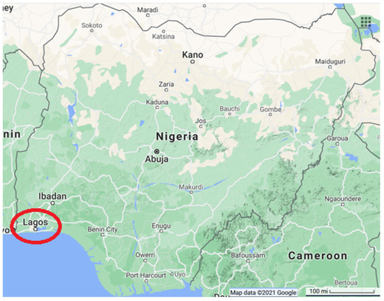 Lagos, highlighted, south of Nigeria in west Africa (Adapted from Google Maps (accessed on 24 August 2021)).