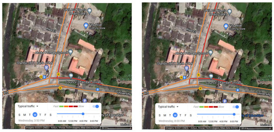 Typical traffic on a Wednesday at 4 p.m. (left) and 8 p.m. (right) on roads leading to the university gate house. Adapted from Google Maps (accessed on 24 August 2021).