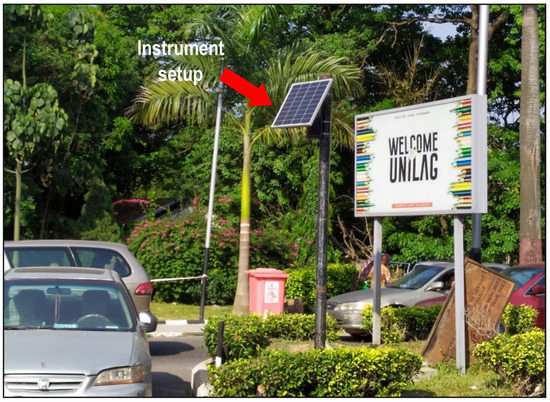 Field measurements were randomly carried out at a busy road node from 22 December 2020 to 1 January 2021 using the EarthSense Zephyr air quality sensor. The sensor is pre-calibrated by the manufacturer by co-locating it with a local authority reference measurement to give accuracy of ±5 µg/m3 for PM2.5. The sensor, which combines on-board battery backup with solar power generation to avoid measurement interruption, was installed on a steel post (Figure 3) at about 2.5 m above the ground, with a clear wide space for the instrument to capture exposure of air pollutant affecting occupants around a building located at the busy road node. The setup of the instrument at this position is done to avoid measurement errors caused by illumination from the sun [35].