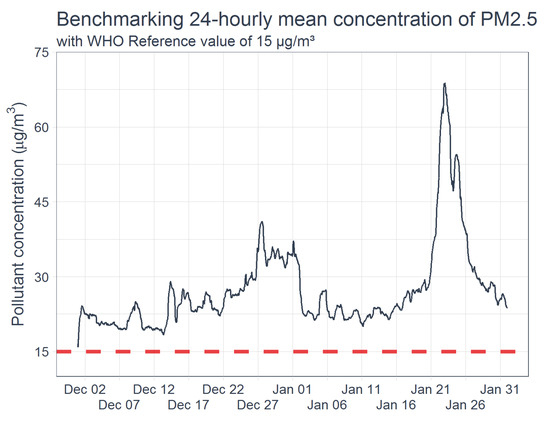 Measured PM2.5 concentration over the observation period compared with WHO referenced threshold.