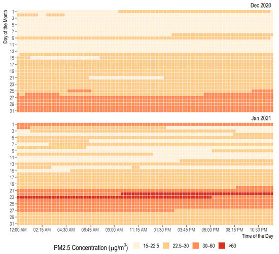 Figure 5 compares the hourly temporal variation of the measured PM2.5 concentration with the WHO referenced value of 15 µg/m3. As shown, over the measurement periods, the PM2.5 concentration profiles exceed WHO reference concentration levels of 15 µg/m3 for the measurement periods. In those periods of high excitation, the PM2.5 concentrations can be as high as over four orders of magnitude.