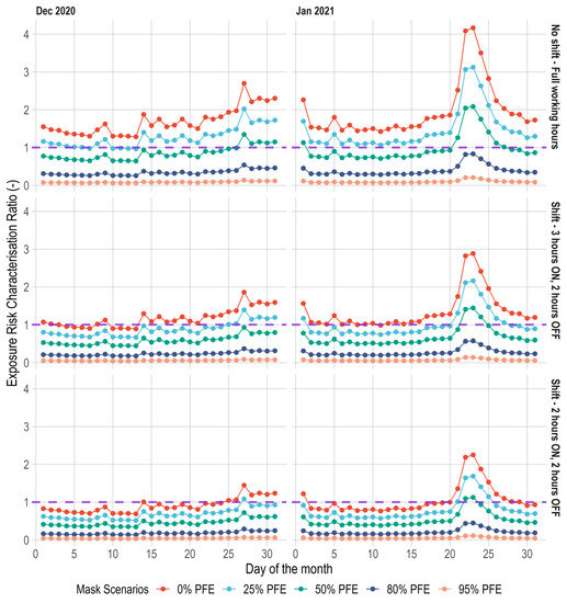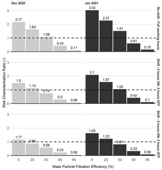Figure 7 shows the influence of control intervention on exposure risk profile to PM2.5 at the test location. The red dotted line on the graph indicates the RCR for PM2.5 based on the WHO reference exposure (i.e., based on the reference concentration) levels. As shown, the results indicate that the shift scenarios have significant influence on exposure risk. In the month of January, without the use of facemasks (i.e., 0% particle filtration efficiency), under the ‘No Shift—Full Working Hours’ the exposure risk is about 3 orders of magnitude above the WHO reference concentration. With ‘Shift—3 h ON, 2 h OFF’ and ‘Shift—2 h ON, 2 h OFF’ scenarios, the exposure risks were reduced to 2 and 1 orders of magnitude above the WHO reference value. Similar effects were obtained for the month of December.