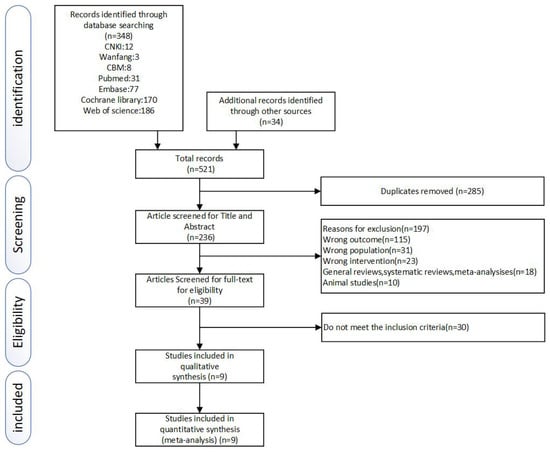 In total, 521 related RCTs were identified after searching the database. Then the duplicates were removed by using EndNote X9. The titles and abstracts of the remaining 236 studies were evaluated by two reviewers independently, and 197 were removed. The full texts of the last 39 studies were reviewed diligently. Seventeen studies were excluded because they did not meet the inclusion criteria, six for poor quality, and seven for missing data. Nine RCTs, [,,,,,,,,], were finally considered eligible in accordance with our inclusion criteria. (More details were shown in Figure 1).