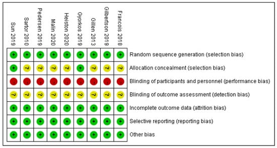 Review judgment of risk bias for each item: percentages across all included studies. Risk of bias levels: low (green or “+”), unclear (yellow or “?”), and high (red or “−”).