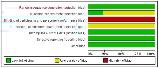 - Higgins, J.P.; Altman, D.G.; Gøtzsche, P.C.; Jüni, P.; Moher, D.; Oxman, A.D.; Savović, J.; Schulz, K.F.; Weeks, L.; Sterne, J.A. The cochrane collaboration’s tool for assessing risk of bias in randomised trials. BMJ 2011, 343, 889–893. [Google Scholar] [CrossRef] [Green Version]