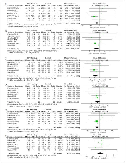Notably, the changes of VO2peak in the HIIT + fasting group were better than the control group (fasting alone or HIIT alone), and the result of the meta-analysis was statistically significant (p < 0.0001). We were still not sure whether different interval or fasting programs could influence the positive effects of HIIT + fasting on VO2peak because of high heterogeneity (I2 > 75%) in the short interval subgroup and low-carbohydrate diet. Similar findings were also reported by Wen et al. [] whose analysis showed that different protocols of HIIT all have more beneficial effects than the control group on VO2peak. The finding of an RCT also revealed that the improvement of the HIIT program (exercise 30 s, interval 2 min) is similar to the MICT program (exercise 45–60 min) on VO2peak []. To determine whether LCD had benefits on VO2peak, we checked all included studies whose control groups were LCD [,,,,] and none of the results reported that there were significant changes in the LCD group. The meaningful improvement in cardiorespiratory fitness might be gained only through exercising.
