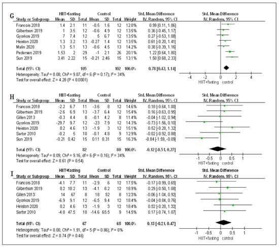 Because fasting may have an impact on the digestive system, we carried out a meta-analysis to determine whether HIIT + fasting could cause more changes in glucose metabolism compared to the control group (fasting alone or HIIT alone). Although there were no significant changes found in FPG or FPI, we found that the differences in the long-term, short-interval, and low-carbohydrate diet subgroup were statistically significant. After further reading of the included studies, we found that HIIT + fasting had a more meaningful improvement than fasting on FPG and FPI in obese people who have a comorbidity [,]. Ryan et al. [] demonstrated that only the most recent exercise sessions rather than long sessions of HIIT or MICT have insulin-sensitizing effects. Recent Studies [,] also suggested that the reduction of FPG in people with type 2 diabetes or the older in the HIIT group is caused by a low rate of exogenous glucose appearance. Cho et al. [] revealed that the metabolic benefit of intermittent fasting may be caused by improving glycemic control, which HIIT was proved to have a similar effect []. From these findings, the effects of HIIT + fasting might profit from both HIIT and fasting and achieve more positive effects on FPG in people with overweight and obesity who have comorbidity.