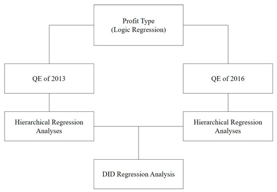 First, a logit regression analysis was conducted to analyze the influencing factors for each profit type. Here, the profit type means whether it is a for-profit institution or not, and the logit analysis was used to analyze the influence factors on this through odds ratio, by using this profit type as a dependent variable. Second, in order to derive the QE (Quality Evaluation) indexes of the social service factors affecting user satisfaction, a regression analysis was performed separately for 2013 and 2016 to analyze the degree of influence. The hierarchical regression analysis was used here to verify the varying effect on the dependent variable as the independent variable changes, by classifying the influence factors of the independent variable on user satisfaction into four stages.