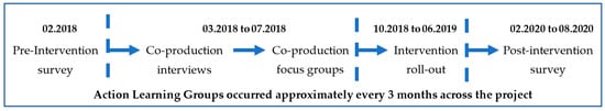 Figure 1 below outlines the stages of data collection and intervention rollout. Interventions were designed using a participatory action research (PAR) methodology. PAR methodologies ensure that beneficiaries of a series of interventions play at least some part in the development, dissemination, and evaluation of those interventions [], thus ensuring that mechanisms developed to support psychological health and wellbeing within this project were developed by NHS staff within participating organisations, and for themselves and their colleagues. Participants’ own expertise within their working situation is therefore used to develop a series of psychological health and wellbeing interventions, focusing on primary organisational interventions and secondary psycho-educational sources of support. As such, the researcher did not determine the interventions to be developed—they were developed through working with employees—and thus they emerged through the PAR process (i.e., interviews and focus groups, and overseen by an action learning group (ALG).