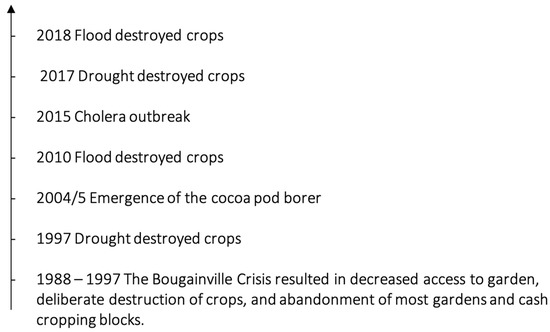 Global environmental change has contributed to several vulnerabilities throughout the Bougainvillean food system. These can manifest in numerous ways: from changes in the hydrological cycle caused by climate change resulting in crop damage, to decreased protein availability due to overhunting from high rates of population growth. Respondents noted numerous stresses and shocks as shown in the timeline in Figure 3. A detailed explanation of stresses and shocks are shown in Supplementary Table S2. The perception of vulnerability among respondents was mixed. Some respondents, particularly those in younger cohorts, were concerned about food procurement in the future due GEC drivers, though others shared the sentiment, “We have plenty of land and good soils. We can always make more gardens. We can always make more food”.