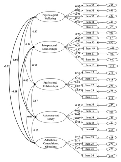 From the 65-item pilot version of the PBP-Q, using exploratory factor analysis, we reached a 5-factor structure including 26 items. Based on the content analysis of the items in the five subdimensions, we labeled the scales as follows: (i) psychological well-being; (ii) interpersonal relationships; (iii) professional relationships; (iv) autonomy and safety; (v) addictions, compulsions, and obsessions. Next, confirmatory factor analysis on the 5-factor and 26-item version of the PBP-Q showed that the global fit of the model is not entirely satisfactory, due to the complexity of the construct. However, all of the items have good and statistically significant loadings on the related factor, ranging between 0.24 and 0.92. Finally, the internal reliability of the subscales and the total score is high (for the total score, α = 0.85).