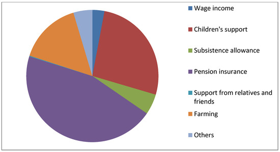 In terms of filial piety income level (as shown in Table 4), with low filial piety income as the reference group, medium filial piety income and high filial piety income have significant effects on life satisfaction of the elderly in Model 1 and Model 2. In Model 3 and Model 4, filial piety income does not have a significant impact on their life satisfaction, which may be explained by personal income and expenditure. Personal annual income includes children’s financial support, which is one of main sources of income for the elderly. The main sources of income of the respondents in this study are shown in Figure 2.