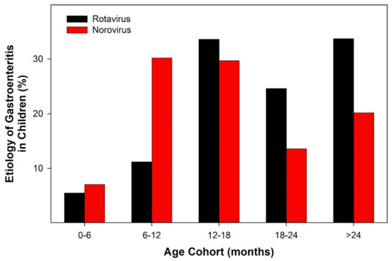 In young children (0–6 months of age), astroviruses were the primary agents of diarrhea of hospitalized Ukrainian children. Noroviruses (Figure 2) and adenoviruses were the most common viruses detected in Ukrainian children between the ages of 6 and 12 months. Rotaviruses emerged as the primary viral infection of AII in hospitalized Ukrainian children 12–36 months of age, but the presence of noroviruses was also common (Figure 2). Currently, we are unable to provide additional information about the data collected because of the Russian Invasion of Ukraine.