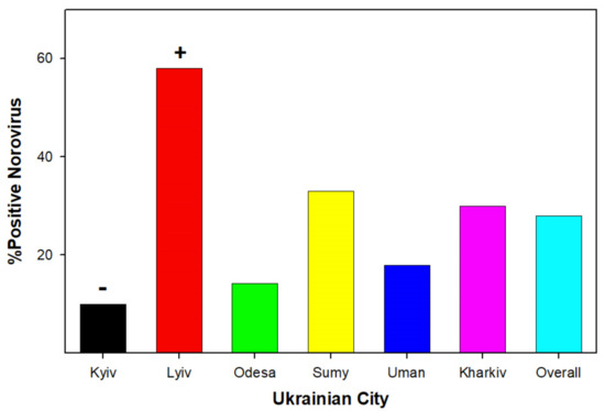 Depicts the percentage of antigen-positive stool samples for norovirus obtained from young Ukrainian children (ages 0-36 months) hospitalized for AII as a function of the community that the fecal specimen was collected from. + indicates significantly higher norovirus antigen samples compared to national average. − indicates significantly lower norovirus antigen samples compared to national average.