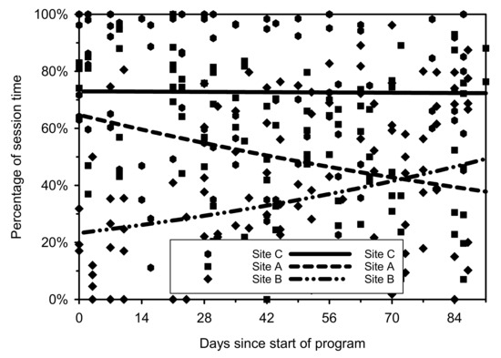 Scattergram of percentage of session time spent in or above participant target heart rate zone across time by site. The fitted regression lines are derived from a multivariable Poisson model.