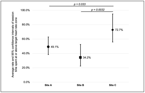 Average percentage and 95% confidence intervals of session time spent in or above participant target heart rate zone, by site.