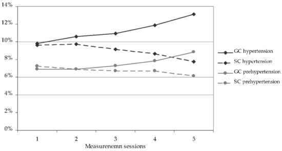 Over the entire study period, the mean systolic blood pressure was more favourable in the SC children than in the GC ones. The average from all measurements showed that normal systolic blood pressure was found in 82.73% of children (GC 81.17%; SC 84.29%; p = 0.0010), hypertension in 10.12% (GC 11.27%; SC 8.96%; p = 0.0000), and prehypertension in 7.15% (GC 7.56%; SC 6.75%; p = 0.0000) (Table 2).