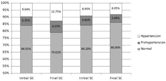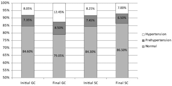Comparison between the initial and the final measurement sessions indicated favourable changes in systolic blood pressure in the SC children and unfavourable changes in the GC ones (Figure 1). In the SC group, the percentage of children with normal systolic blood pressure significantly increased, systolic hypertension significantly decreased, and systolic prehypertension decreased insignificantly. Conversely, in the GC group, the percentage of children with normal blood pressure significantly decreased, hypertension increased significantly, and prehypertension increased significantly as well.