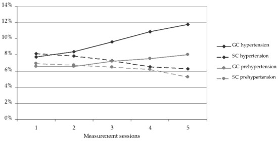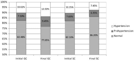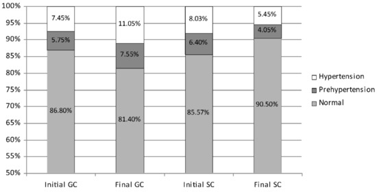 Generally, between the initial and the final measurement sessions, the percentage of SC children with normal systolic blood pressure increased significantly from 83.15% to 86.13% (p = 0.0000) (Table 2). However, in the GC group, the percentage of children with normal blood pressure decreased significantly from 83.25% to 78.03% (p = 0.0001). The prevalence of hypertension decreased significantly in the SC children from 9.60% to 7.75% (p = 0.0010) but increased significantly in the GC ones from 9.82% to 13.12% (p = 0.0000). The frequency of prehypertension decreased slightly in the SC children from 7.25% to 6.12% and increased significantly in the GC ones from 6.92% to 8.85% (p = 0.0242).