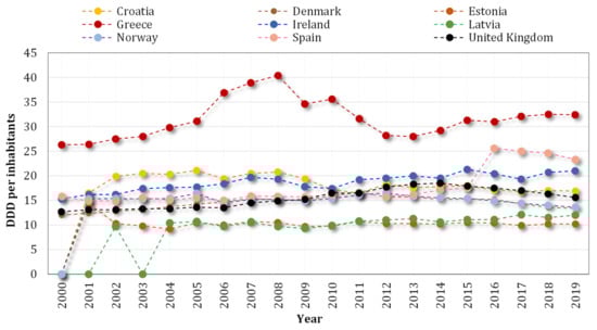 The increasing consumption trend of antibiotics in some European countries from 2000 to 2019. Defined daily dose (DDD) per 1000 inhabitants per day. Data source: [31].