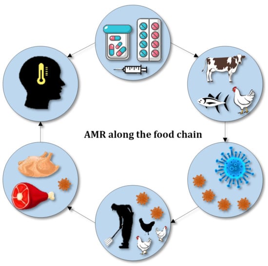 Agriculture intensifies AMR through three primary mechanisms: (i) creating infection caused by livestock products, (ii) transmission of resistant strains through the food chain, and (iii) carrying ARGs from environmental matrices to the human body [32]. According to a study by Hassan et al. [33], antibiotic residues in the liver and kidneys of poultry, fish, and dairy products such as meat, milk, and eggs can drive AMR in humans via transmission through the food chain and increase damage to bone marrow and reproductive organs [34] (Figure 3). Antibiotics can affect microbial community composition, selection of resistant microorganisms, and bacterial physiology via agricultural activities, including animal manure application, aquaculture, and using untreated wastewater, which drives soil and water resource pollution [35,36]. Antibiotic residues have direct or indirect consequences, including reducing or eliminating microbial communities or expanding ARBs [37]. Degrading the soil microbiome caused by antibiotics can break the food chain due to the elimination of soil nutrients, further affecting microbial processes such as mineralization and decomposition of organic matter [17]. By amplicon sequencing, Lucas et al. [38] recognized that antibiotics changed the stoichiometry of soil nutrients, which lessened bacterial plenty, total available nitrogen, and microbial carbon utilization efficiency. In a study by Toth et al. [39], sulfadimethoxine released from manure blocked iron reduction and had an inhibitory outcome on soil nitrification. Kong et al. [40] found that when 5 mM OTC and 20 mM Cu were combined, the indexes of Shannon diversity and evenness were considerably reduced compared to when the two pollutants were separately applied. Additionally, the use of carbohydrates and carboxylic acids in the soil microbial community significantly decreased. Through employing pyrosequencing methods of 16 S rRNA genes, Uddin et al. [41] evaluated the synergistic effects of several antibiotics on the bacterial communities of a paddy soil sample. They recognized that the abundance of actinobacteria and firmicutes was reduced. It has been reported that reducing biodiversity drives an increase in the transmission of infectious agents [42], resulting in the inhabiting suppression of soil pathogens [43]. However, various influences of antibiotics on the activities of soil microbial communities are still assumed as a significant crux [44].