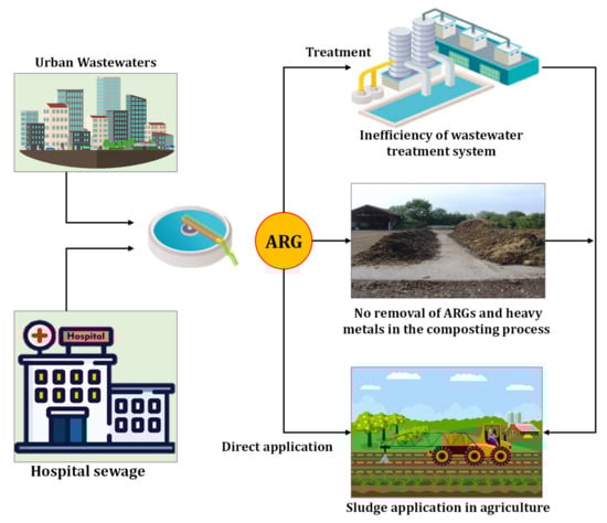 Antibiotic residues and other medical compounds enter the environment directly due to inefficient treatment processing of hospital sewage or urban wastewater [194,195]. Hubeny et al. [196] recognized wastewater treatment systems as foci of AMR. The results obtained by Rahube et al. [197] revealed that crop production in lands fertilized with human waste without appropriate pretreatment techniques drives an extra load of ARGs into crops. Zarfel et al. [198] hypothesized that population transferring between human infectious E. coli and beta-lactamase-producing bacteria transpires in sewage treatment systems. Sahlström et al. [199] probed sludge samples of a treatment plant in Sweden and demonstrated that applying sewage sludge for fertilizing purposes prompts vancomycin-resistant enterococci in agricultural ecosystems. Markowicz et al. [200] concluded that utilizing sewage sludge might induce public health concerns, even at low doses. The routes of entry of ARGs from urban and hospital sewage to farmlands are shown in Figure 5.