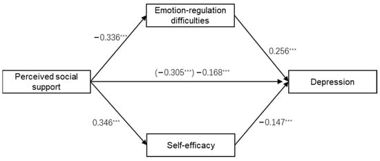 Table 2 reports the means, standard deviations, and correlation coefficients between all variables of interest. The results demonstrate that perceived social support and depression were significantly negatively correlated (r = −0.305, p < 0.001). Moreover, depression was significantly positively related to difficulties in emotion regulation, whereas it was negatively associated with self-efficacy. These correlations provided the basis for the following mediation analysis.