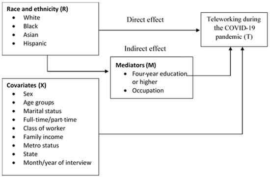 Covariates: Some variables might affect the direct and indirect relationship of race on teleworking. To control for this effect, the following variables were included as covariates: sex; age (16–24, 25–34, 35–54, 55–64, 65+); marital status (married; widowed, divorced, or separated; never married); family income ($34,999 or less, $35,000–$74,999, $75,000–$149,999, $150,000 & above); class of worker (private, public, self-employed); full-time or part-time status; and geographical information including metropolitan or central city (central city, unknown, not in metro area, and outside central city) and state. Survey month/year (May 2020 through July 2021) was also included as a covariate to account for trends in teleworking, unemployment rate, and other time-variant macro variables. Industry was not included as a covariate because it is highly correlated with the occupation variable.
