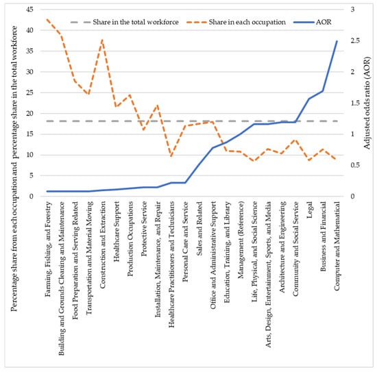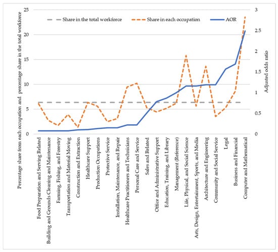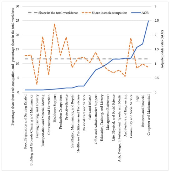 A different picture was observed in the case of Asian workers (Figure 4). In occupations in which the odds of teleworking were very small, the shares of Asian workers were also very low compared to their share in the total workforce, and vice versa. For instance, the shares of Asian workers in occupations for which teleworking was nearly impossible (AOR < 0.1)—farming, fishing, and forestry; building and grounds cleaning and maintenance; transportation and material moving; and construction and extraction occupations—were 73%, 56%, 38%, and 79% lower than their share in the total workforce. Contrarily, in computer and mathematical occupations, for which the odds of teleworking were 2.5 times higher than in the managerial occupations, the share of Asian workers was 270% higher than their share in the total workforce. Using the CPS data, Gaffney et al. [] also showed that managers and software developers were among the five occupations with the most teleworkers. Mayo et al. [] also showed that workers in high-tech and knowledge-based occupations were more likely to telework.