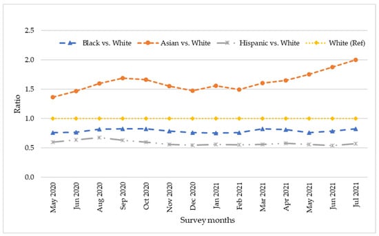 Teleworking is one of the strategies followed by employers to reduce the spread of COVID-19. In addition to facilitating flexibility and improving work–family balance [,] and well-being [], teleworking reduces the risk of exposure to COVID-19 and influenza-like illnesses and the risk of unemployment for those who have jobs that can be done remotely. However, despite an overall improvement in teleworking during the pandemic [,], marked racial disparities persist. During May 2020 through July 2021, the odds for Black and Hispanic workers to telework due to the pandemic were much lower than for both White and Asian workers after controlling for covariates.