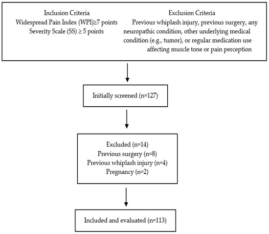 From 127 women with FMS initially screened for inclusion and exclusion criteria, a total of 113 women (age: 52.8 ± 10.8 years) were included. Figure 1 shows the flow diagram with the inclusion and exclusion criteria. Table 1 summarizes all features (clinical, psychological, psychophysical, health-related, and cognitive data) employed for fitting the BLR.