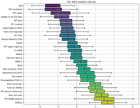 Figure 2. Credible intervals for all the parameters in the Bayesian Linear Regression (BLR) model for Central Sensitization Inventory (CSI). The X axis represents the values of the coefficients of the model, which are random variables, meaning that they do not have a specific value, but rather a “probabilistic value”, with some values being more probable than others. The negative sign (left side of the figure) means that the correlation with the CSI score is negative. The positive sign (right side of the figure) means that the correlation with the CSI score is positive. The magnitude, e.g., 3.5, indicates the relative strength of that correlation; it is relative in the sense that you can directly compare different coefficients because variables have been standardized. Accordingly, boxplots represent the distribution of a model coefficient, with whiskers enclosing its 95% credible interval. The 95% credible interval of a model coefficient is the range of values within which 95% of its probability falls.