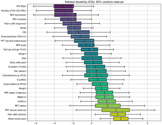 Figure 3. Credible intervals for all the parameters in the Bayesian Linear Regression (BLR) model for Fibromyalgia Impact Questionnaire (FIQ). The X axis represents the values of the coefficients of the model, which are random variables, meaning that they do not have a specific value, but rather a “probabilistic value”, with some values being more probable than others. The negative sign (left side of the figure) means that the correlation with the FIQ score is negative. The positive sign (right side of the figure) means that the correlation with the FIQ score is positive. The magnitude, e.g., 3.5, indicates the relative strength of that correlation; it is relative in the sense that you can directly compare different coefficients because variables have been standardized. Accordingly, boxplots represent the distribution of a model coefficient, with whiskers enclosing its 95% credible interval. The 95% credible interval of a model coefficient is the range of values within which 95% of its probability falls.