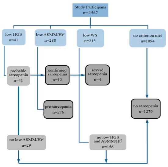 Scheme of identification and assessment of sarcopenia in participants of the study. HGS—hand grip strength, ASMM—appendicular skeletal muscle mass, Ht—height, WS—walking speed.