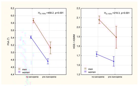 Differences in the phase angle of impedance and the index of the functional quality of the appendicular skeletal muscles between participants diagnosed with pre-sarcopenia and participants without sarcopenia. Points with vertical lines represent the mean with 95% confidence intervals; PhA—phase angle; HGS—hand grip strength; ASMM—appendicular skeletal muscle mass; H(3,1555), p-Kruskal-Wallis rank ANOVA test results.