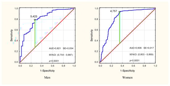 In the multivariate modeling of the probability of pre-sarcopenia, the variables for which significance were confirmed in univariate analyzes were taken into account (Table 2). In the input model, sex (OR: 1.34, p = 0.18) and HGS/ASMM (OR: 0.82, p = 0.33) turned out to be insignificant factors in explaining the probability of pre-sarcopenia, and therefore were omitted in the subsequent stages of the analysis. Finally, age, BMI and PhA turned out to be the significant predictors (Multiple model 1 in Table 2). The sensitivity, specificity and accuracy of this model were 64.9%, 97.2% and 91.5%, respectively, but the differences between the expected and observed rates were significant (HL(8) = 27.13, p < 0.001). Removal of BMI (Multiple model 2 in Table 2) improved the fit of the model (HL(8) = 15.38, p = 0.052), lowering the sensitivity to 57.6%. Model 2 specificity and accuracy were 97.3% and 90.2%, respectively. In both models, the phase angle was the strongest predictor, and the presence of other covariates slightly changed its contribution to explaining the probability of pre-sarcopenia compared to the unadjusted (univariate) model. The analysis of the ROC curve showed a high classification performance of PhA (AUC = 0.821, p < 0.001 in men and AUC = 0.836, p < 0.001 in women) and the cut-off points for pre-sarcopenia PhA = 5.42° in men and PhA = 4.76° in women (Figure 3).