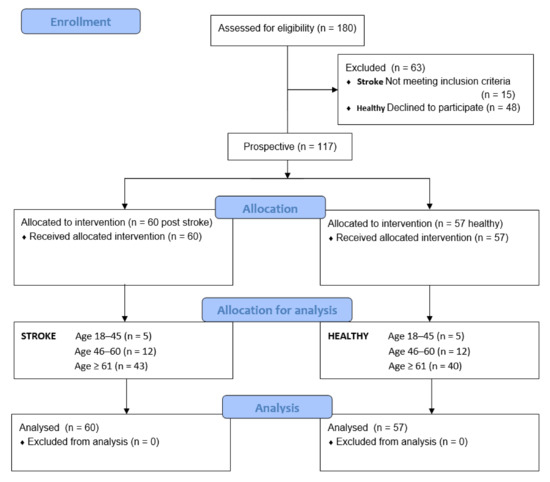 A total of 180 people were examined before inclusion: 63 people (15 stroke patients and 48 healthy) were excluded because of their functional condition and declined to participate. Finally, 117 males and females were recruited from among patients of the Teaching Department of Rehabilitation of the Military Medical Institute (MMI) and University of Social Sciences in Warsaw, including 60 post-stroke patients (study group) and 57 neurologically undisturbed volunteers (control group). The flow of participants, through each stage of the study and for analysis, is shown below (Figure 1).