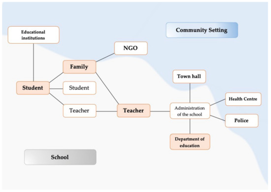 As we have already mentioned, we focus on two sets of relationships: firstly, the relationships between students and their families, the school, and among students themselves. Secondly, we focus on the relationships established between the school and other institutions. The starting point is the beginning of the quarantine, when teaching became virtual and relations continued telematically. The first impact was on the students. The closure of schools to contain the spread of the pandemic led to an abrupt separation of the youngest students from their peer group. These early relationships are fundamental to the acquisition of social and communication skills, and in a quarantine context, the acquisition of cultural values and norms formulated by older generations becomes more difficult [24]. Moreover, the implementation of sanitary norms and, in particular, the use of masks are causing difficulties in the acquisition of language skills by pupils [8].