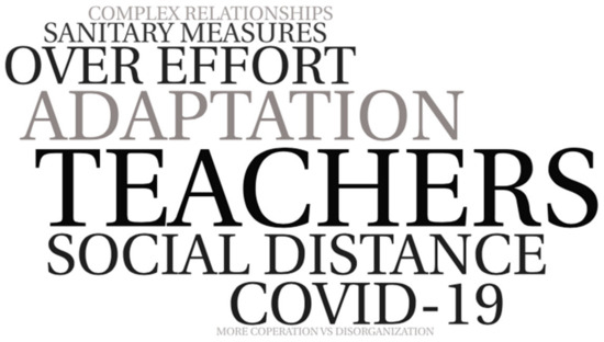 In the relation with teachers, the testimonies of the students show that they suffered the impact of COVID-19 on their relationships with the different actors in the school and the community (Figure 4). Excessive care in hygiene and compliance with measures were triggers for changes in the dynamics of day-to-day relationships. Along with this, there is a perceived overload in the efforts to adapt the lessons to virtual teaching moments and the individualized character that affect teaching styles, less close and to the detriment of cooperation.