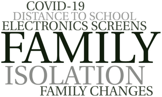 The students’ testimonies about the family connection reveal a very diverse universe (Figure 5). There are students who do not feel qualified to have a perception of the impact on the family institution, alluding to its complexity and heterogeneity. Those who do have a perception highlight a bipolarity marked by the bonding/deterioration of intra-family relations. Additionally, they perceive that family links were strengthened, and the time they spend together increased their value. However, they also perceive certain problems related to episodes of emotional instability, distancing—especially for fear of infecting older members of the family—and changes in the way parents care for their children, marked by the excessive use of electronic screens and teleworking.