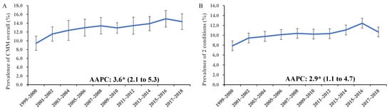 All statistical analyses were performed following the analytic guidelines provided by the National Center for Health Statistics [18,19], accounting for the complex survey design, strata, and sample weight of the NHANES, which generated estimates for the total non-institutionalized civilian population of the U.S. First, the age-standardized prevalence (per two-year cycle) of cardiometabolic multimorbidity (overall, two concurrent, and ≥three cardiometabolic diseases) were estimated in the entire U.S. adult population separately and then stratified by age, gender, and race/ethnicity. Corresponding sampling weights for the fasting laboratory tests were used for each cycle to account for non-response, non-coverage, and unequal probabilities of selection to generate representative estimates of the total of non-institutionalized U.S. adults. This study used the 2000 census as the standard population. The prevalence of common patterns of cardiometabolic multimorbidity (case counts ≥ 20 per cycle) in the entire population was reported. The latest prevalence of this comorbidity and common patterns in the U.S. adults were presented. In addition, the affected population counts (in millions) were calculated using the population totals during 2017–2018 [20]. Second, joinpoint regression models were applied to assess the trends in the prevalence of cardiometabolic multimorbidity in the total population and among subgroups from 1999 to 2018 [19]. With the age-standardized prevalence and standard error from 10 NHANES two-year cycles entered, Joinpoint software assessed whether there were statistically significant alterations (i.e., joinpoints) in the trends. The program started with 0 joinpoints and tested whether ≥1 joinpoints (in this study, maximum 1) were significant to be added to the model. Two-year cycle percentage change (APC) and averaged APC (AAPC), corresponding 95% CI, and p for the trend were generated to assess the overall trends in the prevalence of cardiometabolic multimorbidity during the past two decades. In the current analyses, the results were tagged with “unreliable” when the corresponding case counts were <20 since the results estimated based on such a small sample size were prone to be influenced by chance [21]. The data were analyzed with R version 4.0.4, STATA version 17, and Joinpoint Regression Program version 4.9.0.0 (National Cancer Institute). A two-sided p < 0.05 was used to determine statistical significance.