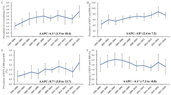 Trends in the age-adjusted prevalence of cardiometabolic multimorbidity and specific patterns among U.S. adults, 1999–2018. Notes: The AAPC was derived from joinpoint regression models to assess the averaged trends in the prevalence of comorbidity. Panel (A): For CMM overall; Panel (B): For two concurrent cardiometabolic diseases; Panel (C): For ≥three concurrent cardiometabolic diseases; Panel (D): For CMM pattern, HTN, and DM; Panel (E): For CMM pattern, HTN, CHD, and DM; Panel (F): For CMM pattern, HTN, and CHD. CMM, cardiometabolic multimorbidity; HTN, hypertension; DM, diabetes mellitus; CHD, coronary heart disease; AAPC, averaged two-year cycle percentage change. * p for trend <0.05.