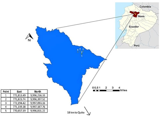Map of Nono district, Pichincha province, Ecuador. The overall figure illustrates the geographical orientation of Ecuador within Central America. In the expanded map of the inset, the numbers (1–5) indicate the locations where the samples of water were taken, with the Universal Transverse Mercator coordinates of each point listed in the table below.