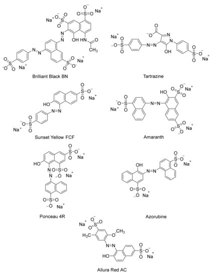 Azo dyes are characterized by the presence of an azo bond (-N = N-) between two or more aromatic rings [21,22]. The versatility of azo dyes renders them very appealing for various industries such as food and textiles. However, the xenobiotic nature of these dyes calls for proper evaluation of their harmful effects. In the food industry, the use of azo dyes should be critically assessed as they are often used as colorants for sweets and desserts with children as target consumers [23]. Although there are regulations on which dyes may be used or not, these are different by country, which adds to the difficulty of standardizing protocols for the usage of dyes [23]. There are thousands of azo dyes used in various industries. Some of the better-known azo dyes used in the food industry are Brilliant Black BN, Tartrazine, Sunset Yellow FCF, Amaranth, Azorubine, Ponceau 4R, and Allura Red AC [23] (Figure 1).